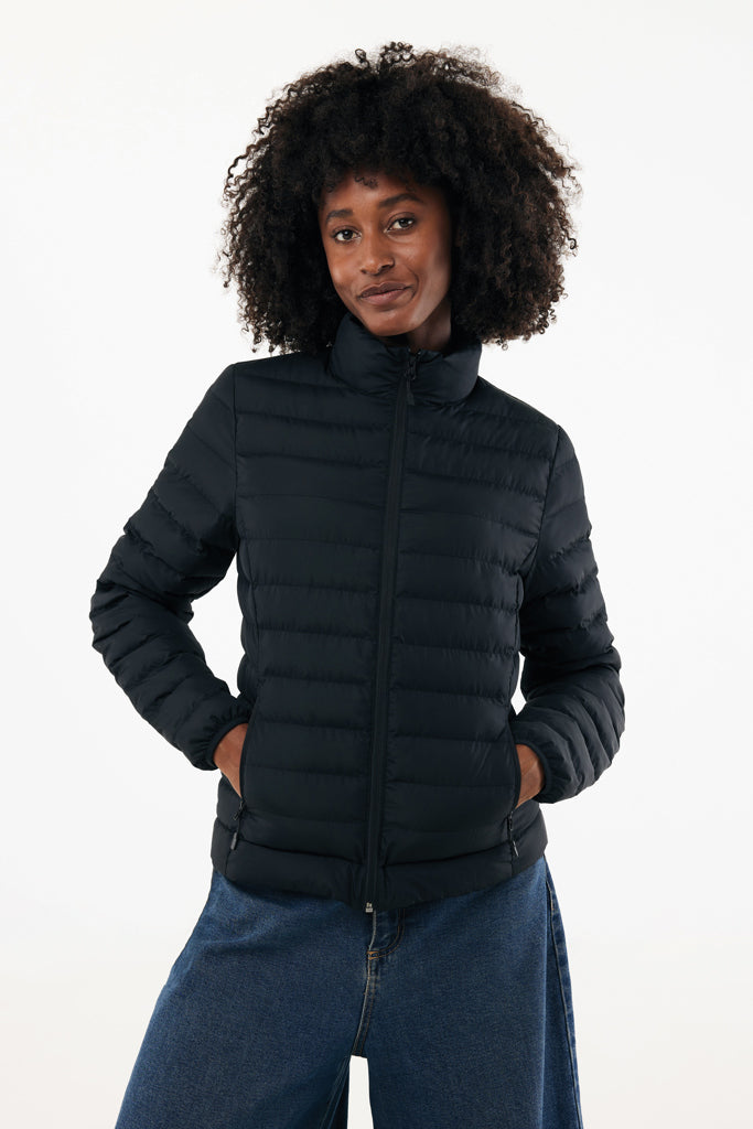 Damen Steppjacke Medium-Fit aus 100% recyceltem Polyester. Sie verfügt über einen umgekehrten Reißverschluss vorne, sowie praktische Reißverschlusstaschen in den Seitennähten. Alle Reißverschlüsse sind mit farblich abgestimmten Zipper-Pullern versehen, die für einen edlen Look sorgen. Die Ärmelbündchen sind elastisch und alle Nähte auf der Innenseite sind mit recyceltem Band sauber verarbeitet.